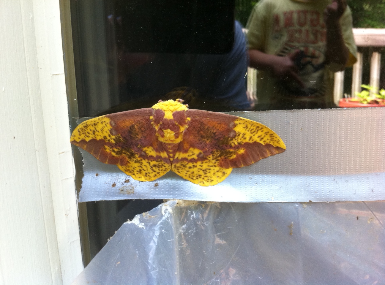 It is hard to get a sense of scale from this picture, but he is approximately six feet wide. That hairy neon-colored bastard clung to the screen door for two days before it soared away above the trees. And probably carried somebody’s dog with him. Also, one day when my husband was traveling (well of course he was) I went down to the basement to do the laundry and was greeted by this mother-effer, sitting right by the dryer: